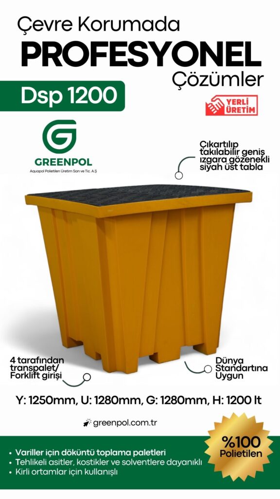 DSP1200 kimyasal döküntü toplama paleti, endüstriyel alanlarda kimyasal, yağ ve sıvı sızıntılarını güvenli şekilde toplamak için tasarlanmış yüksek dayanımlı polietilen döküntü (sızıntı) paleti çözümüdür. İş sağlığı, çevre güvenliği ve yasal uyumluluk gereksinimlerini karşılamak üzere geliştirilmiştir.
