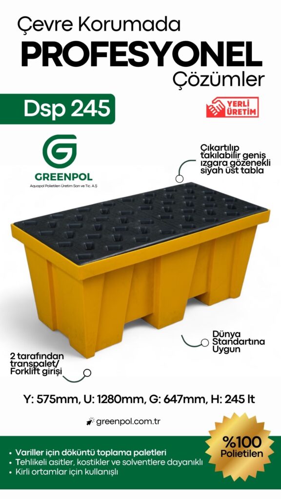 DSP245 kimyasal döküntü toplama paleti, endüstriyel alanlarda kimyasal, yağ ve sıvı sızıntılarını güvenli şekilde toplamak için tasarlanmış yüksek dayanımlı polietilen döküntü (sızıntı) paleti çözümüdür. İş sağlığı, çevre güvenliği ve yasal uyumluluk gereksinimlerini karşılamak üzere geliştirilmiştir.